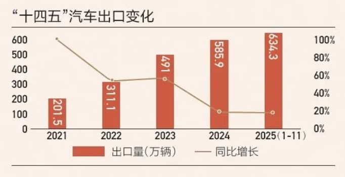 11月,我国汽车出口72.8万辆,环比增长9.3%,同比增长48.5%,为历史上首次超过70万辆;1~11月,汽车出口634.3万辆,同比增长18.7%,全年有望冲击700万辆的历史新高。随着国内市场增速放缓,企业加码出口战略,“不出海就出局”成为共识。