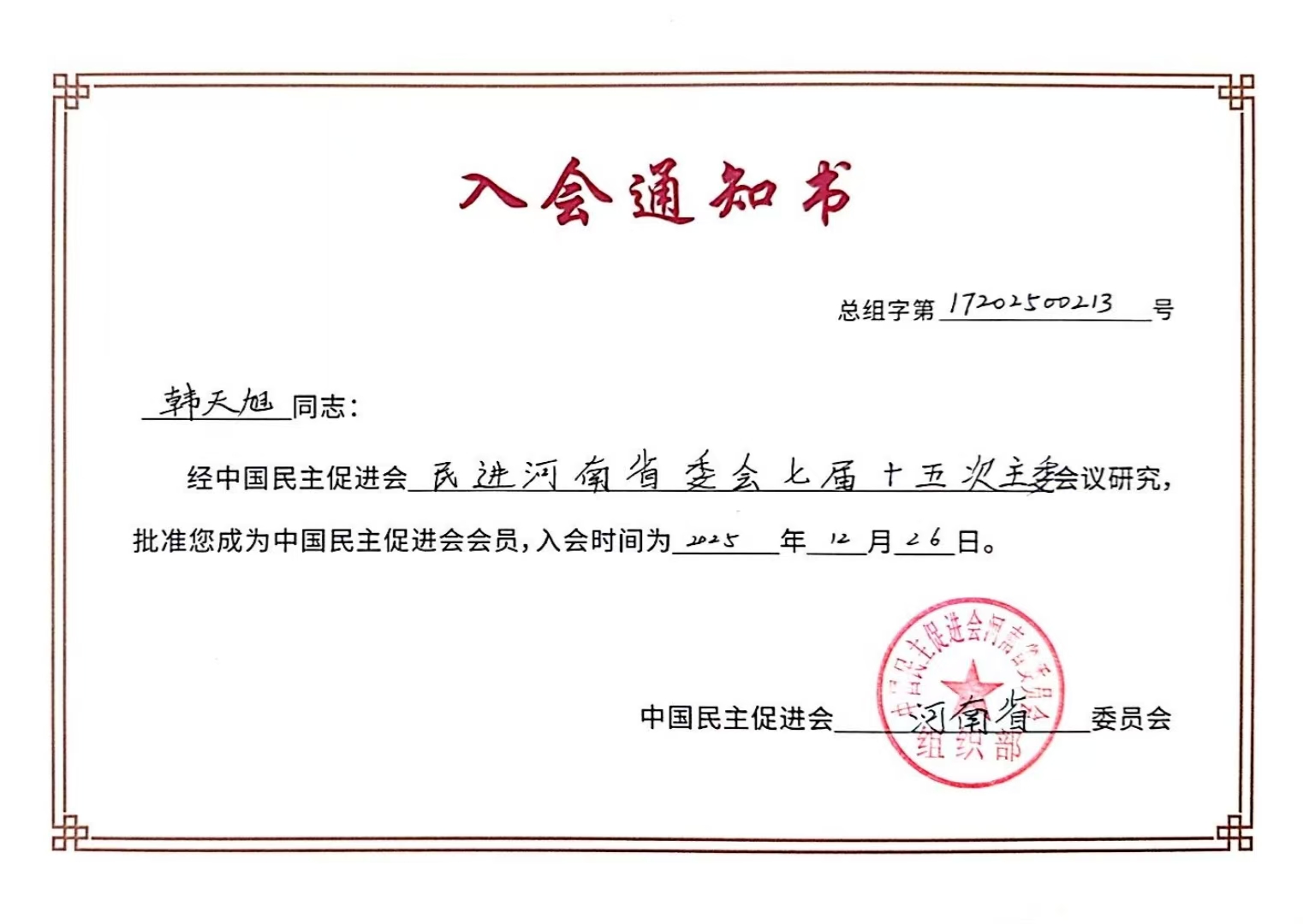 河南省新能源商会党支部书记、会长刘东晓表示,2024年底由5A级社会组织、全国先进社会组织河南省新能源商会牵头,联合国内知名龙头企业发起成立河南省充电产业联盟,河南省新能源商会副秘书长、河南省充电产业联盟秘书长韩天旭同志长期从事助推新能源产业发展,全力推动中西部充电基础设施建设和产业生态资源协同工作,在河南省新能源及充电产业领域具有广泛影响力、号召力。此次加入民进,展现了我国多党合作事业的生机与活力,也体现了新时代民主党派吸引凝聚各方面优秀人才致力于促进国家发展,有利于民进组织在新能源领域的参政议政工作,能够更好地反映行业发展诉求,为国家能源战略实施和生态文明建设建言献策,是新能源行业与多党合作事业相结合的具体体现,期待他在新的平台上继续为推动河南新能源及充电产业发展贡献力量。