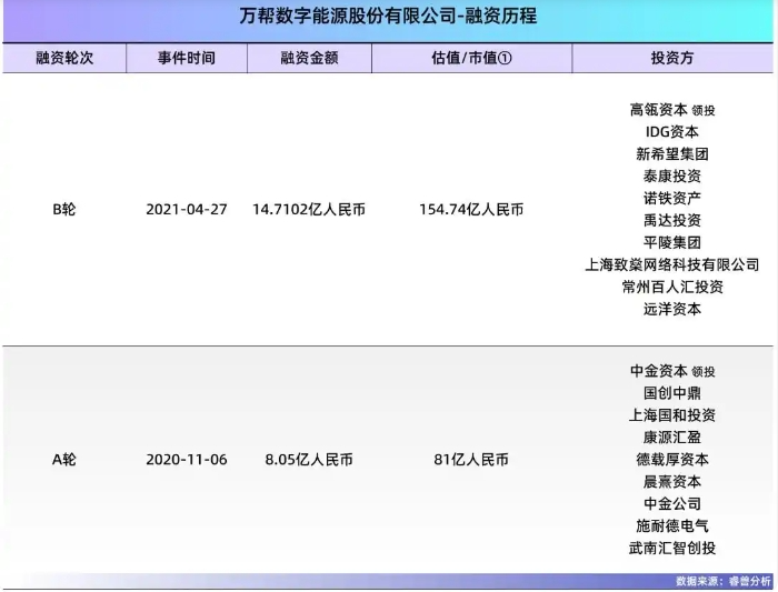 2021年5月,万帮能源完成B轮融资,由高瓴资本领投,IDG、北京泰康投资、禹达投资等跟投,投后估值达155亿元。