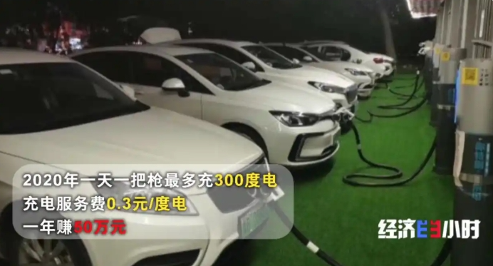 江涛的充电站,建设于2020年,抛开土地成本,他总共投资90多万元。当时附近充电站少,周围的新能源车都会来这里充电。那时一天一把枪最多能充三百度电,充电服务费三毛来计算,一年能够赚50万元。