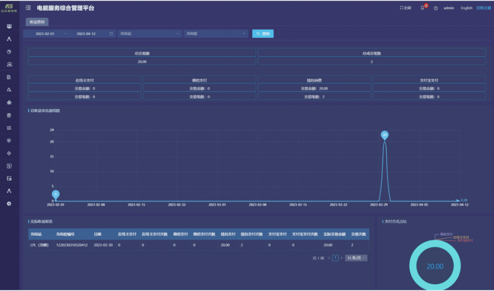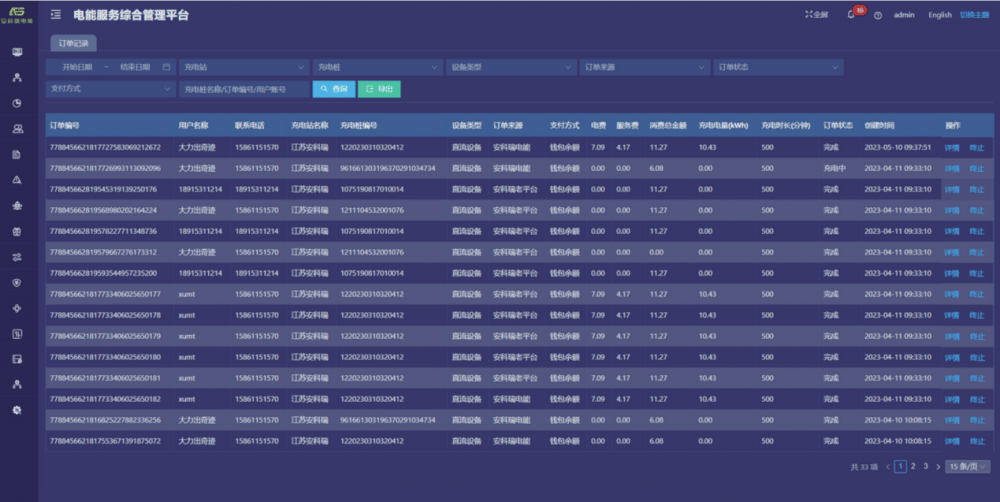 订单记录:提供实时/历史订单查询、订单终止、订单详情、订单导出、运营商应收信息、充电明细、交易流水查询、充值余额明细等功能。