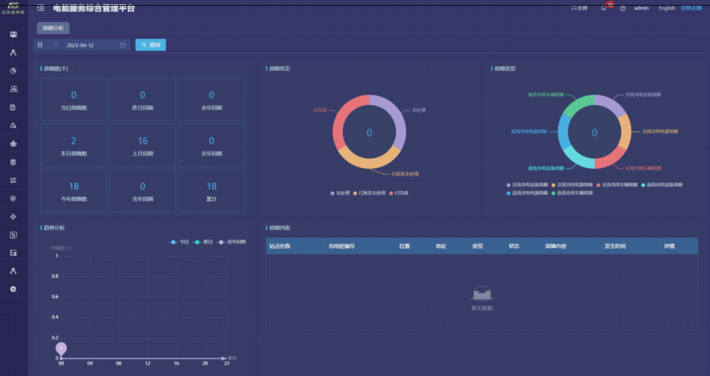 故障分析:提供故障汇总、故障状态饼图、故障趋势分析、故障类型饼图等功能。