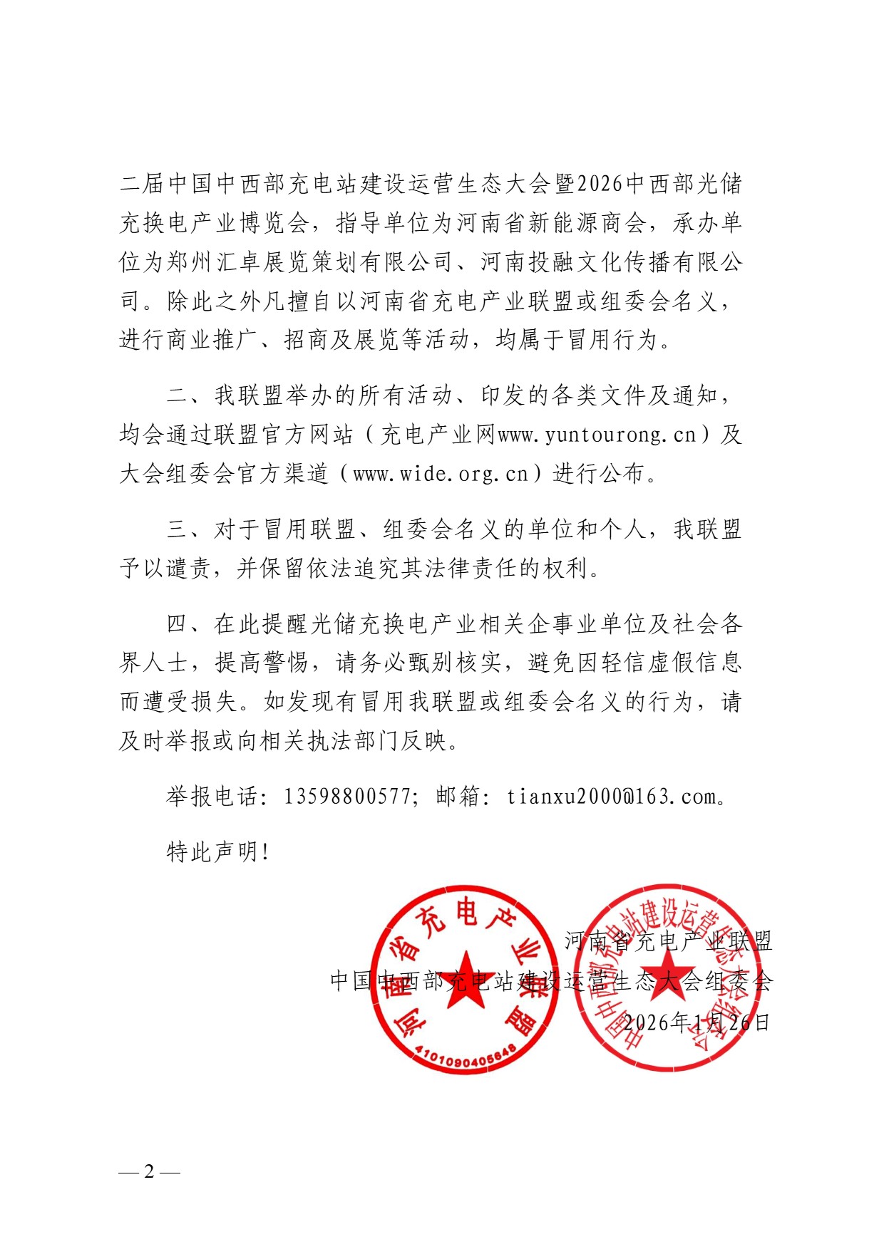 除此之外凡擅自以河南省充电产业联盟或组委会名义,进行商业推广、招商及展览等活动,均属于冒用行为。
