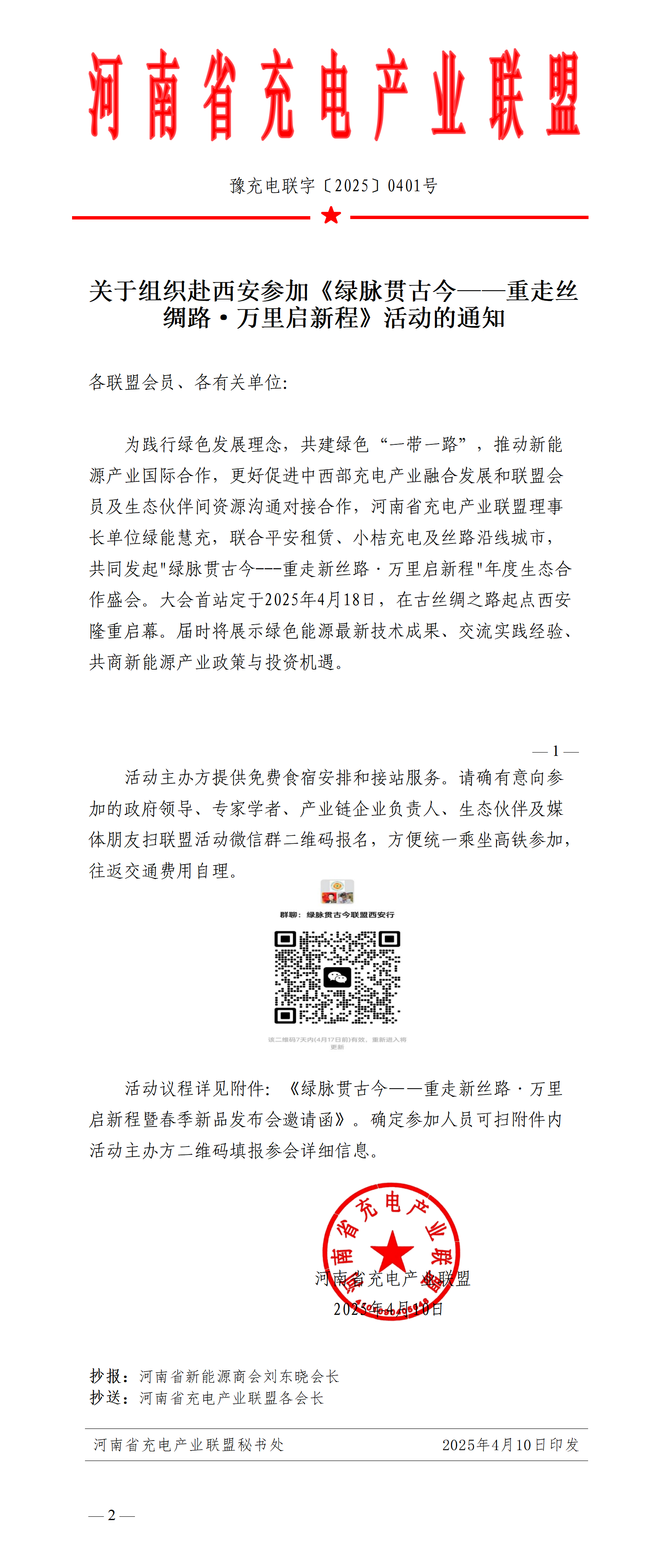 为践行绿色发展理念,共建绿色“一带一路”,推动新能源产业国际合作,更好促进中西部充电产业融合发展和联盟会员及生态伙伴间资源沟通对接合作,河南省充电产业联盟理事长单位绿能慧充,联合平安租赁、小桔充电及丝路沿线城市,共同发起"绿脉贯古今---重走新丝路·万里启新程"年度生态合作盛会。大会首站定于2025年4月18日,在古丝绸之路起点西安隆重启幕。届时将展示绿色能源最新技术成果、交流实践经验、共商新能源产业政策与投资机遇。
