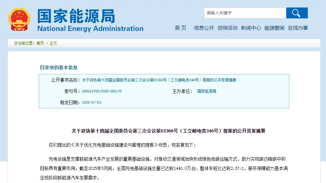 关于政协第十四届全国委员会第三次会议第02366号(工交邮电类346号)提案的公开答复摘要 你们提出的《关于优化充电基础设施建设与管理的提案》收悉,现答复如下: 充电设施是支撑新能源汽车产业发展的重要基础设施,对推动交通领域加快形成绿色低碳运输方式、助力实现碳达峰碳中和目标具有重要作用。截至2025年5月底,全国充电基础设施总量已达到1440.0万台,整体车桩比达到2.57:1,服务保障能力基本满足现阶段新能源汽车发展需求。 一、关于健全地区性充电基础设施专项规划有关建议 国家能源局持续推进充电基础设施规划建设,推动充换电网络建设布局,指导地方主管部门建立健全规划工作机制,科学编制充电基础设施专项规划。2024年初,国家能源局综合司印发《电动汽车充电设施布局规划编制指南》(国能综通电力〔2024〕19号),指导各地科学规划充电设施的建设规模、网络结构、布局功能和发展模式,结合电动汽车发展趋势,适度超前安排充电基础设施建设。下一步,国家能源局将持续指导地方主管部门以构建高质量充电基础设施体系为重点,科学制定布局规划,通过规划引导企业精准投建,着力化解设施布局的结构性矛盾,提升充电站的利用率和用户便利性。 二、关于完善充电设施管理机制有关建议 2023年6月,国务院办公厅印发《关于进一步构建高质量充电基础设施体系的指导意见》(国办发〔2023〕19号),提出地方各级政府建立发展改革、能源、交通运输、自然资源、工业和信息化、住房城乡建设、商务、消防救援、城市管理等有关部门紧密配合的充电基础设施建设协同推进机制。对于充电车位管理,我们支持地方和运营企业不断完善管理规定,保障各方利益。下一步,国家能源局将适时制定出台提升充电行业运营服务质量的政策文件,进一步探索充电车位管理方式,研究设施评级方案,不断完善“僵尸桩”强制整改或拆除的政策措施。 三、关于推动充电设施与电力系统发展相协调的建议 在车网融合互动方面,我们支持电动汽车通过充电设施与电力系统加强互动。2023年12月,国家发展改革委、国家能源局等部门联合出台了《关于加强新能源汽车与电网融合互动的实施意见》(发改能源〔2023〕1721号),积极支持车网融合互动。2025年3月,国家发展改革委、国家能源局等部门通过地方申报、组织评审,在全国范围内选取了9个城市和30个项目开展车网互动规模化应用试点,加大力度推广智能有序充电,鼓励开展双向充放电探索应用。我们支持完善充电设施标准体系,推动大功率柔性充电堆等新技术应用。 在配电网建设方面,为支撑大规模充电设施规划建设,国家能源局指导电网企业不断加大配电网升级改造,组织地方编制配电网发展实施计划,按照《关于新形势下配电网高质量发展的指导意见》(发改能源〔2024〕187号)有关要求,优化电网设施布局,引导充电设施合理分层接入中低压配电网。国家能源局大力推进农村电网建设改造,5年累计安排中央预算内投资250亿元,重点支持边远、脱贫等地区农村电网建设改造,加快补齐农村电网短板,提升供电保障能力。 下一步,国家发展改革委将进一步研究健全调节性资源价格机制,更好发挥充电基础设施等具有调节能力的电力资源对构建新型电力系统的支撑作用,加快推进电力市场建设,形成市场化充电价格体系,积极推动充电基础设施参与电力市场交易。国家能源局将持续加大车网互动工作力度,持续推进农村电网建设改造,指导地方做好配电网规划与充电网络规划衔接,助力构建城市面状、公路线状、乡村点状的充电基础设施布局。 感谢你们对国家能源工作的关心和理解,希望今后能得到你们更多的支持和指导。 国家能源局 2025年7月23日 |