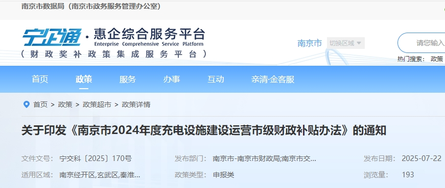 市级财政补贴对象为南京市主城六区(玄武区、秦淮区、建邺区、鼓楼区、栖霞区、雨花台区)及南京经济开发区范围内公共服务领域充电设施建设运营单位。纳入财政补贴的充电设施应符合江苏省新能源汽车充(换)电设施建设运营管理办法、江苏省新能源汽车充电设施验收细则中的相关要求以及各级充电设施建设牵头部门出台的相关管理办法和认定的技术要求。